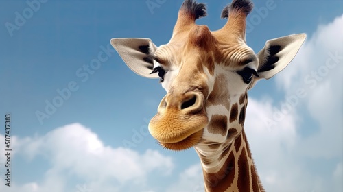 giraffe, animal, mammal, fauna, neck, zoo, safari, wild, nature, tall, head, sky, long, portrait, blue, advertising space, brown, beak, isolated, big, mouth, horizontal, generative, ai