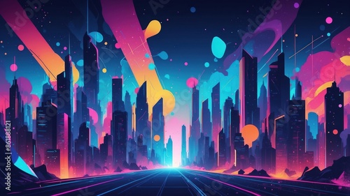 wave, futuristic, virtual, vector, synth, shiny, science fiction, retro, rave, night, light, geometric, game, neon, funky, 80s, design, 90s, city landscape, background, city, banner, poster, vintage, vibrant, landscape, star, party, 1980, flier, illustration, planet, building, bright, style, tower, skyscraper, skyline, view, glow, sky, architecture, scraper, panorama, urban, scene