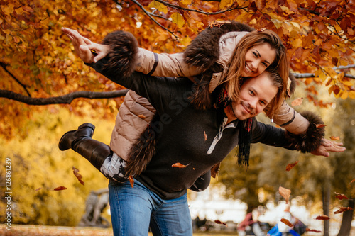 couple, park, fall, enjoyment, love, fun, piggyback, autumn, forest, beautiful, smiling, embraced, sunlight, yellow, gold, together, carrying, relaxation, nature, happiness, fashion, season, cute, joy, horizontal