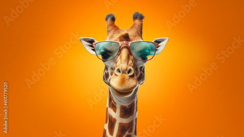 Funny giraffe in sunglasses in trendy style on yellow background. Portrait summer. Pet care, generated AI Generative AI