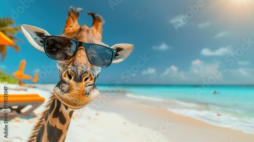 Funny giraffe with sunglasses on the tropical beach. Travel background with silly animal on summer holida