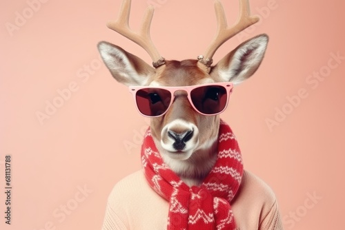 Funny portrait of a Christmas reindeer wearing a sweater and glasses on a pink background.