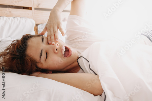 Funny sleepy yawning Asian woman just wake up on her bed.