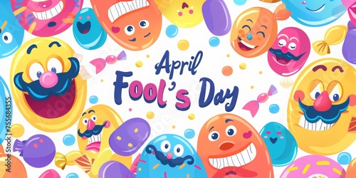 Funny smiling faces with mustaches and candy for April Fool's Day poster design. Background with text April Fools' Day and cartoon emoji smiley faces, mustache, clown hat