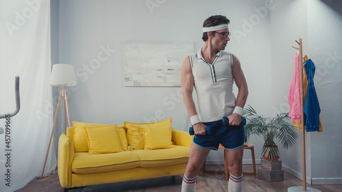 funny sportsman exercising with dumbbells in living room, retro sport concept
