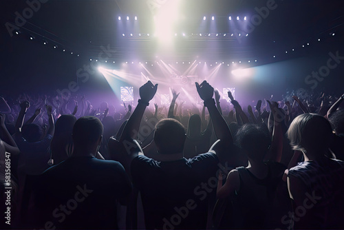 Future of crowded concert hall on stage with scene stage lights, rock show performance