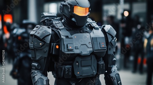 robot, armoring, futuristic, technology, soldier, military, city, urban, science, fiction, exoskeleton, android, machine, artificial, intelligence, helmet, dark, grey, black, steel, gear, future, advanced, security, enforcement, patrol, powerful, strong, modern, weapon, combat, tactical, crowd, street, scene, background, detail, design, photo