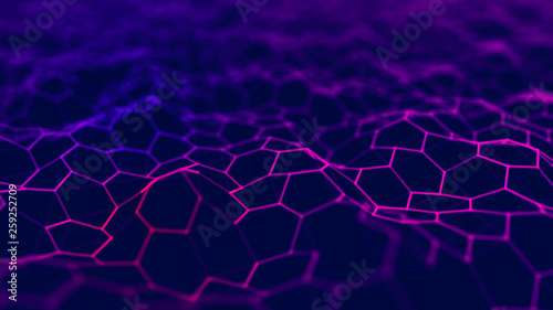 Futuristic blue hexagon background. Futuristic honeycomb concept. Wave of particles. 3D rendering. Data technology background