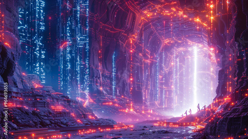 futuristic, cavern, digital, glowing, technology, science fiction, structure, neon, light, surreal, cyber, virtual, landscape, advanced, fantasy, tech, artificial, high technology, abstract, innovation, advanced technology