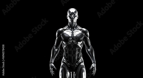 robot, android, android, cyborg, metallic, chrome, silver, futuristic, science fiction, science fiction, artificial intelligence, ai, technology, digital, innovation, future, bionic, mechanical, engineering, high technology, cyber, virtual, powerful, strong, elegant, sleek, modern, advanced, anatomy, body, torso, chest, head, figure, illustration, black background, isolated, studio shot, glossy, polished, carbon fiber, detailed, automation, computing, progress