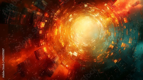 city, futuristic, city landscape, swirling, light, bright, orange, red, dark, teal, building, abstract, technology, glow, energy, vibrant, dynamic, motion, intense, fiery, warm, cool, contrast, texture, pattern, design, art, digital, illustration, graphic, background, space, cosmic, tunnel, vortex, perspective, depth, modern, complex, intricate, detail, structure, line, shape