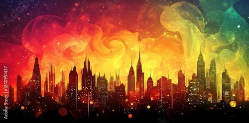 city landscape, futuristic, city, building, skyscraper, metropolis, urban, skyline, night, cosmic, sky, star, nebula, space, vibrant, colours, red, orange, yellow, green, abstract, art, painting, digital, illustration, design, background, wallpaper, fantasy, science, fiction, architecture, light, glow, atmosphere, energy, fiery, swirling, cloud, smoke, texture, style, modern, contemporary