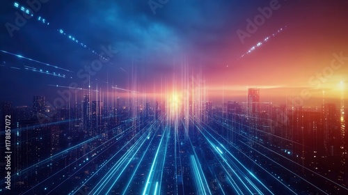 Futuristic Cityscape with Digital Lights and Sunset Background