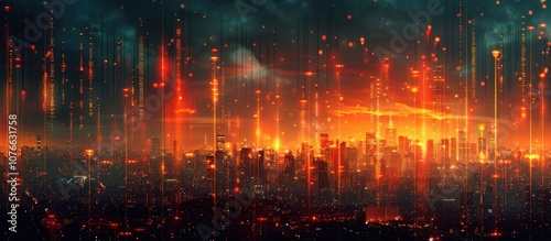 city, futuristic, neon, light, building, night, digital, art, urban, skyline, orange, glow, abstract, modern, technology, design, architecture, fantasy, science fiction, landscape, concept, illustration, graphic, dark, bright, colourful, vibrant, style, geometric, pattern, background, artwork, texture, atmosphere, aesthetic, future