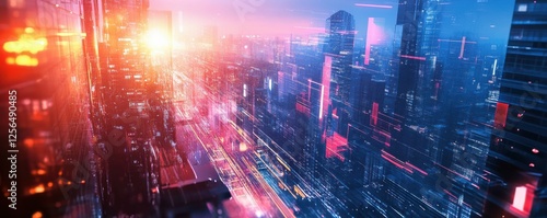 Futuristic cityscape with neon lights at sunset