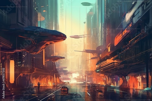 Futuristic Cityscape with Vibrant Colors and Flying Vehicles Created with Generative AI