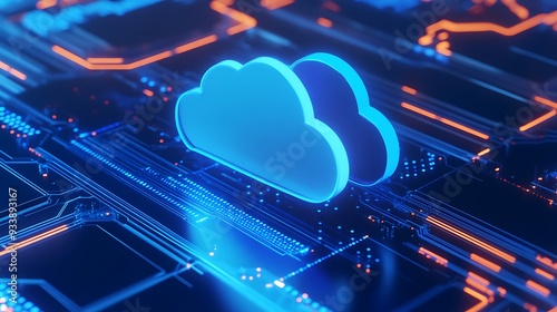 Futuristic cloud computing technology concept with glowing blue and orange circuitry, representing digital data storage and networking.