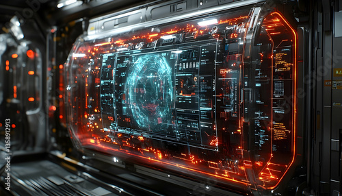 Futuristic control panel displaying glowing interfaces and data in a sci-fi spaceship interior