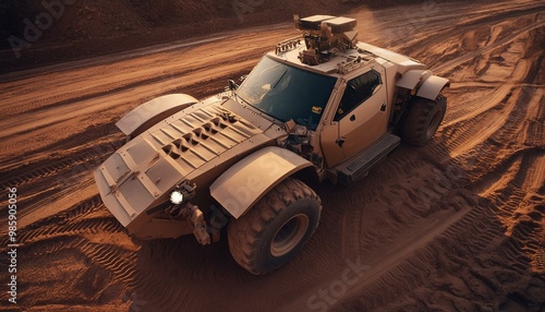 futuristic, desert, vehicle, combat, heavy duty, dune, terrain, armored, action, engine, force, monster, powerful, utility, apocalyptic, color image, giant, dusty, sand, tank, tire, modern, offroad, tactical, dark, landscape, armored car, armored vehicle, wheel, dusk, extreme, detailed, metal, aerial view, heavy, expedition, cyborg, automobile, driving, fast, fuel, car, automotive, dirt, exploration, nature, dust