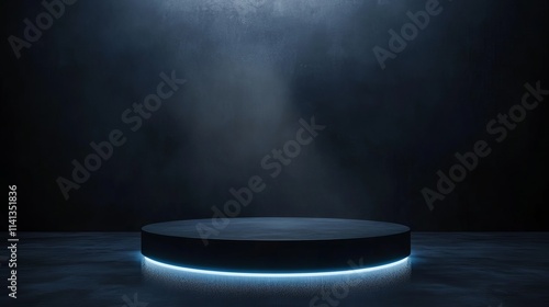 Futuristic dark podium with dynamic lighting and reflections in a modern abstract background