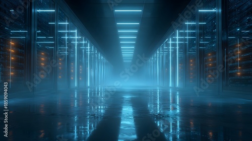 Futuristic Data Center Corridor with Glowing Blue Lights and Reflections.