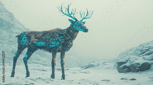 cervid, animal, nature, snow, winter, landscape, technology, future, fantasy, science, fiction, digital, art, illustration, mechanical, glowing, blue, circuit, metallic, wildlife, forest, mountain, cold, mist, fog, creative, poster, cover, isolated, design