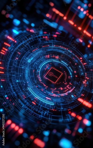 Futuristic digital abstract design featuring neon blue and red patterns, perfect for technology and innovation themes.