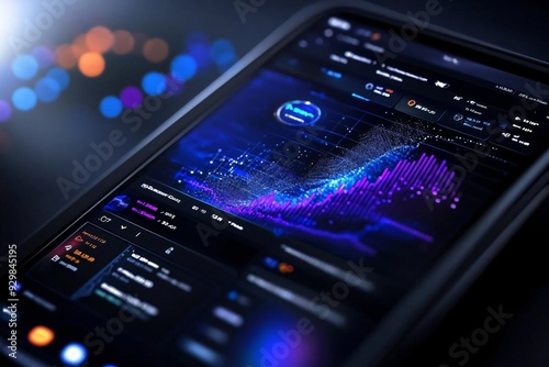 Futuristic digital finance dashboard on smartphone, showcasing trading data and analytics in vibrant colors for modern investors.