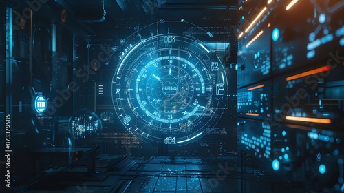 Futuristic digital interface with data visualization in a high-tech environment, depicting a concept of advanced technology and cyberspace.
