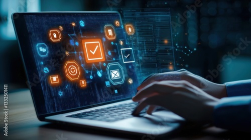 Futuristic Digital Workspace with Interface Icons and Laptop View