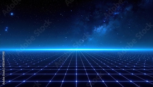 Futuristic Grid Landscape with Starry Sky and Nebula.
