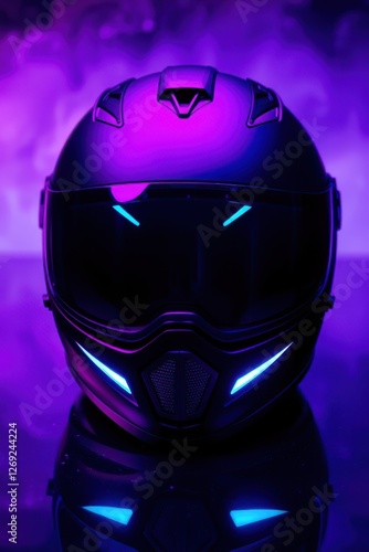 helmet, futuristic, glow, purple, blue, technology, design, protection, modern, sleek, reflective, surface, lighting, neon, style, accessory, dark, bright, accent, innovation, metallic, shadow, headgear, visibility, safety, equipment, gear, atmosphere, smoke, vibrant, bold, closeup, detail, pattern, structure, texture, aerodynamic, contour