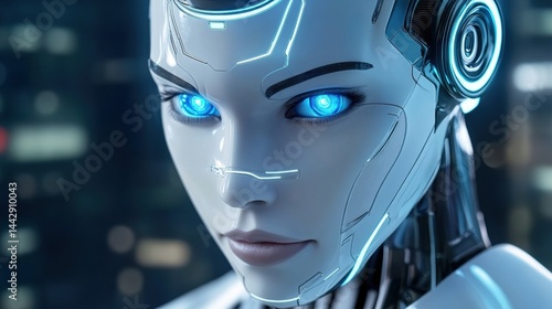 robot, technology, artificial intelligence, futuristic, city, humanlike, portrait, glowing, cybernetic, eye, design, closeup, innovation, science fiction, digital, modern, aesthetic, intellect, machinery, metallic, sleek, atmosphere, environment, beauty, detail, emotion, vision, interaction, shape, form, personality, advanced, realism, creative, robotic, cybernetic, light, expression, feature, urban, concept, imagination, future, landscape, electronic, human, virtual