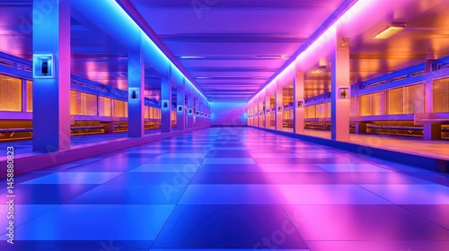 Futuristic illuminated corridor with vibrant neon colors and symmetrical design, creating a dynamic atmosphere