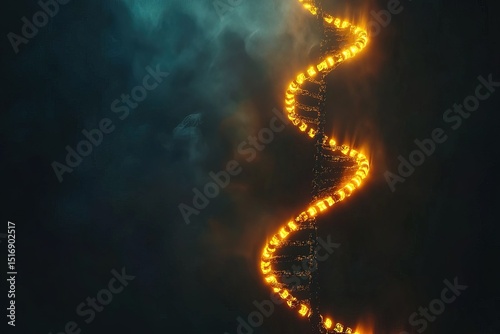 Futuristic illustration of glowing DNA spiral on dark background, symbolizing genetics, science and biotechnology concepts