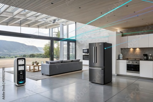 Futuristic Minimalist Smart Home with Interconnected Appliances and Laser Beams of Light for Modern Living Spaces