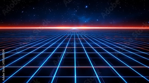 futuristic, neon, grid, landscape, starry, sky, horizon, digital, environment, technology, abstract, geometric, illumination, light, pattern, space, cosmos, blue, red, line, perspective, night, science fiction, design, optical, universe, imaginative, bright, glowing, surreal, scenery, artwork, graphic, dreamlike, wave, retro, vibrant, modern