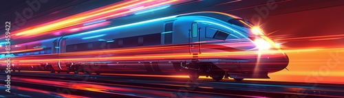 Futuristic neon of highspeed trains, rendered in minimal styles, capturing the blur of motion against a sharpened landscape
