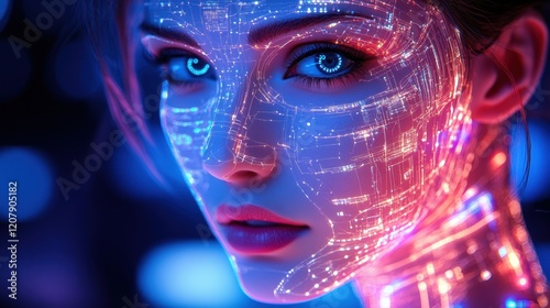 Futuristic Portrait of Woman with Glowing Circuitry on Face