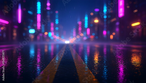 Futuristic rainy road glowing with neon signs and misty atmosphere