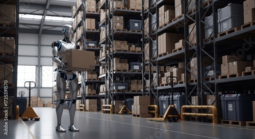 Futuristic robot carrying package inside factory photo