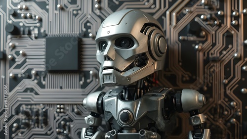 Futuristic Robot Model Against Circuit Board Background