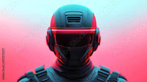 Futuristic robot soldier with a sleek helmet and glowing visor, standing against a vibrant neon gradient background.
