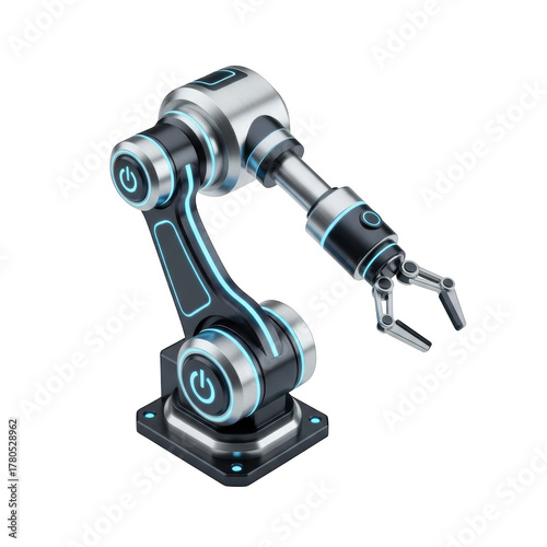 Futuristic Robotic Arm with Blue Neon Accents and Power Symbols on Background Keywords: robot, robotic arm, industrial, automation, technology, futuristic isolated on a transparent background