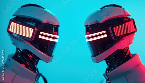 Futuristic robots facing each other with neon lights, showcasing advanced technology and cybernetic design. Sci-fi concept. High-tech innovation.