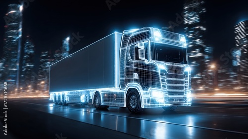 futuristic, highway, night, digital, logistic, transportation, truck, semi, transport, vehicle, automotive, freight, cargo, delivery, road, city, urban, technology, future, neon, glow, electric, mobility, innovation, automation, autonomous, driving, smart, network, connection, grid, datum, information, ai, artificial, intelligence, design, engineering, illustration