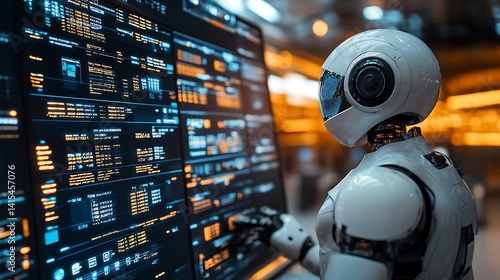 Futuristic Sentinel of Data: A sleek robot observes data, immersed in a technological environment, symbolizing the rise of AI and the evolving human-machine relationship.