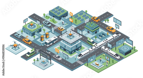 city, smart, future, urban, technology, transportation, isometric, illustration, modern, architecture, building, infrastructure, network, connectivity, digital, innovation, sustainability, green, energy, solar, panel, drone, car, vehicle, electric, autonomous, train, subway, public, transport, street, road, traffic, flow, system, datum, center, communication, wireless, cyberspace, of, thing, concept, design, graphic, art, scene, view