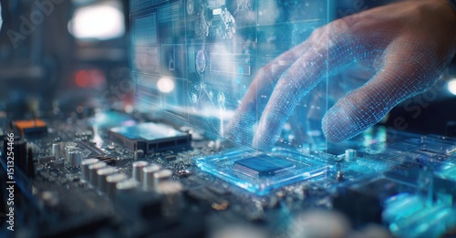 Futuristic Technology: Hand interacts with glowing interface and circuit board, symbolizing innovation and the future of computing.