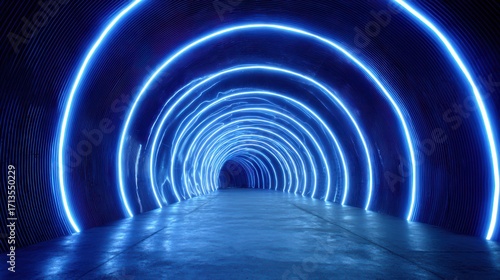 Futuristic tunnel illuminated by blue neon lights, creating an immersive and captivating atmosphere.